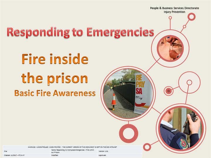 This Fire in the Prison training aims to provide DCS Staff with the relevant skills and knowledge to respond safely and effectively to fire within the Prison confines. This course will take approximately 30 minutes to complete.